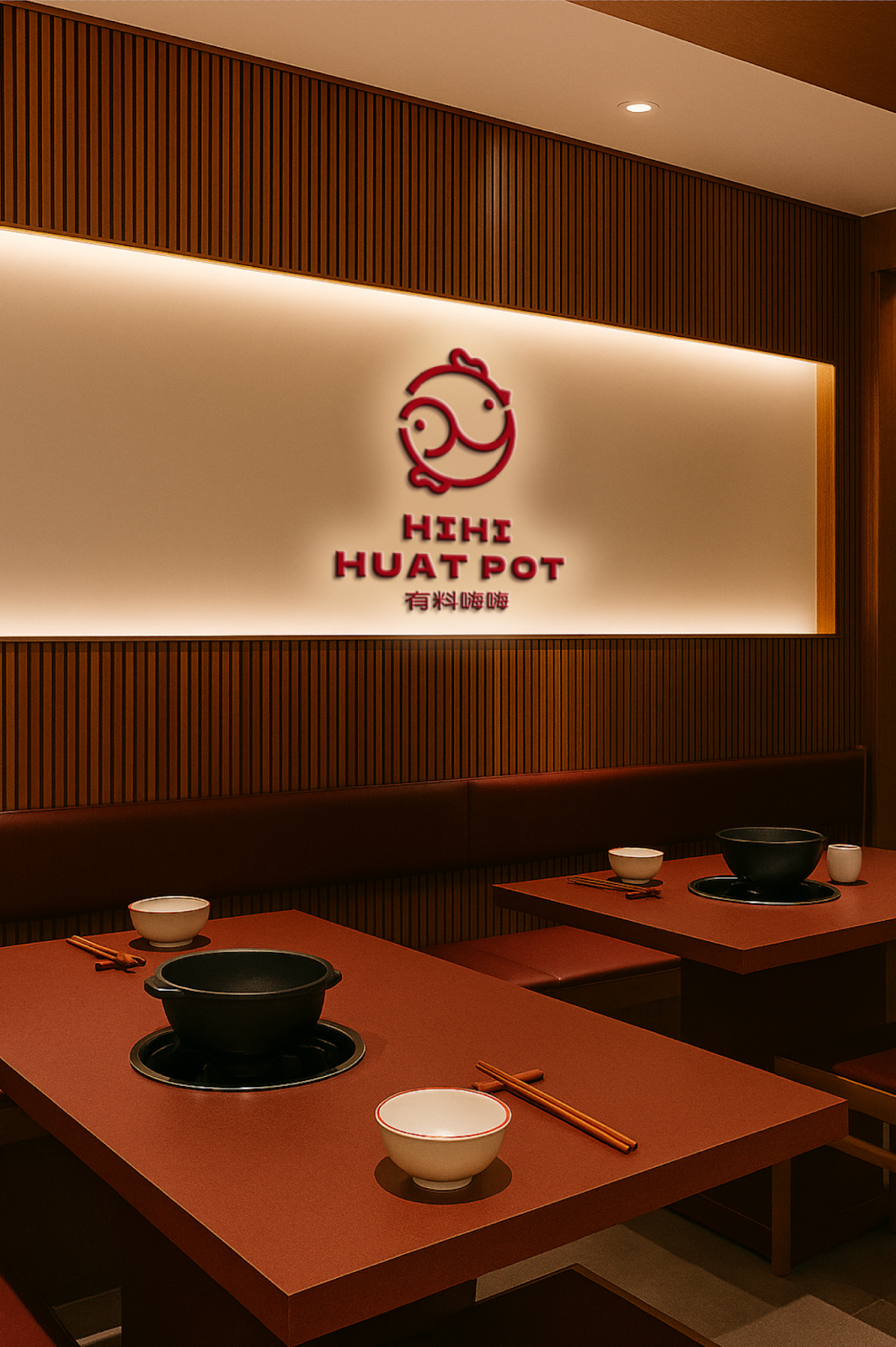 The circular logo, inspired by the hotpot itself, represents unity, balance, and abundance. Interlocking forms echo harmony, while subtle references to chicken, fish, and yin-yang celebrate cultural depth. Every detail, from pot handles to pattern design, extends this balance across mediums.